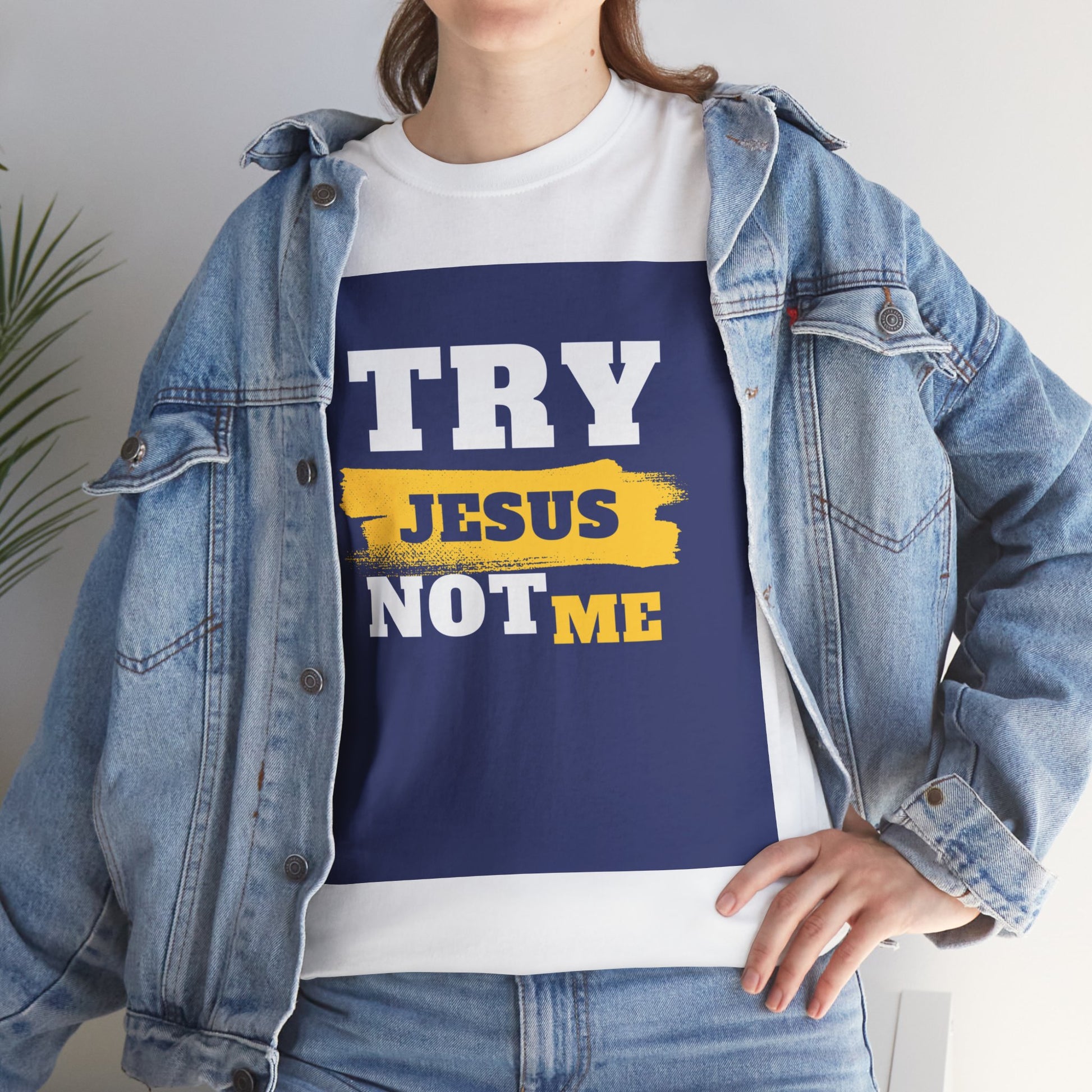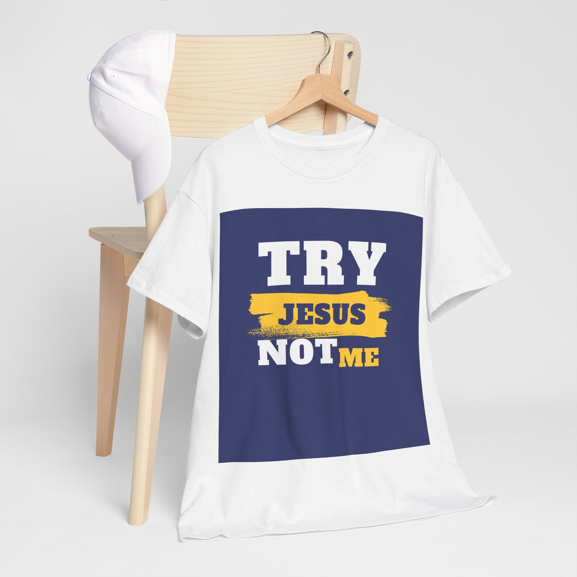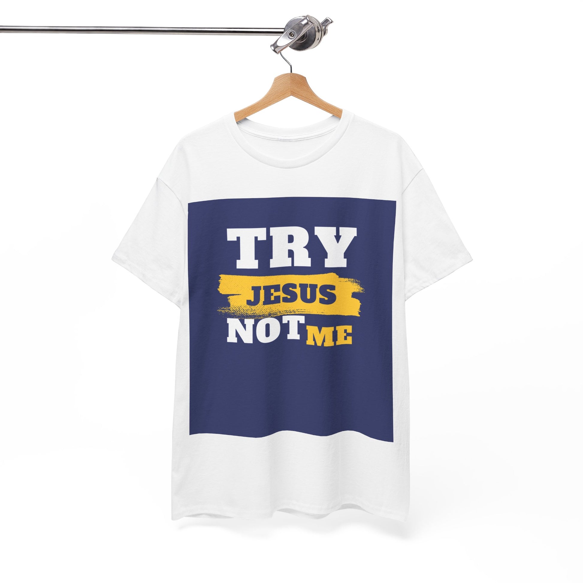 Send a powerful message with our 'Try Jesus Not Me' Tee. This bold and impactful design encourages you to embrace the teachings of Jesus. Wear it proudly as a reminder to let the grace of faith guide your path. Make a statement, make a choice – try Jesus.
